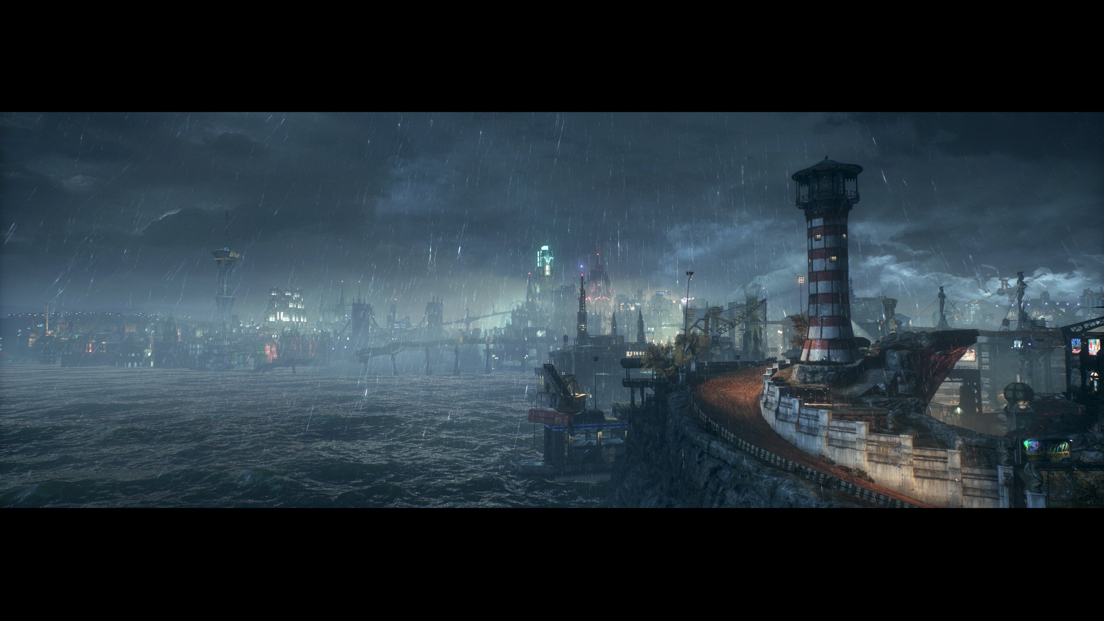 Le phare de Bleake Island, au nord-est de l'île. Loin tout à gauche, on peut apercevoir la grande tour d'Arkham City.